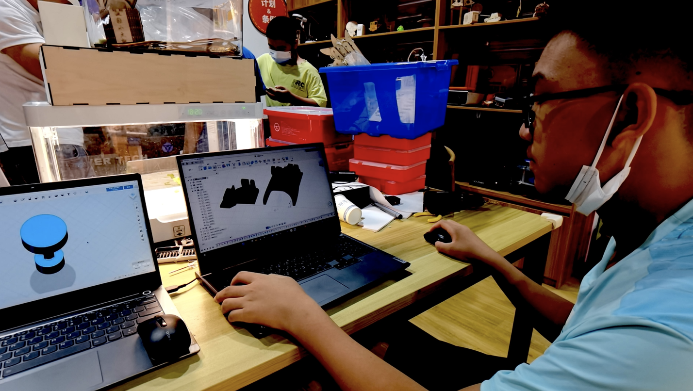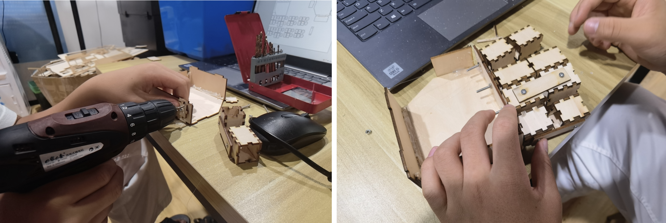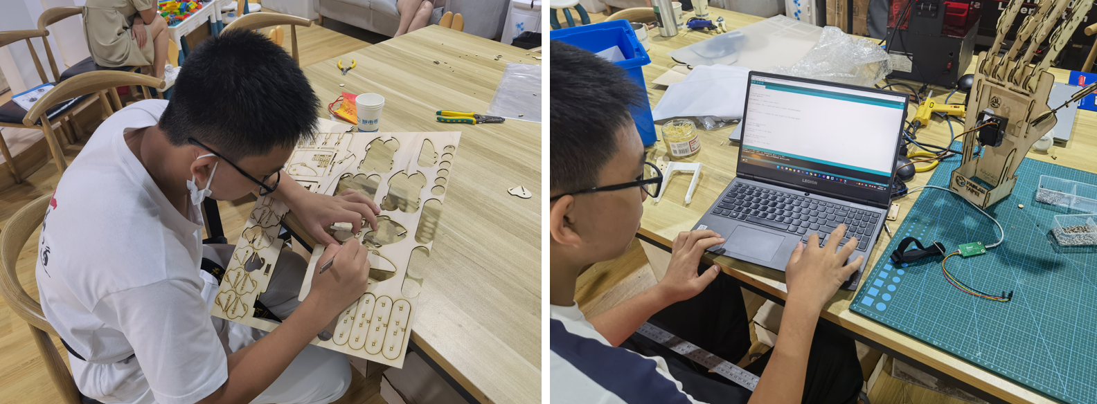 4)经过调研,手指的结构是联动课可以弹回的结构,使用激光切割快速重新测试原型,并使用Arduino编程,可以正常运作。