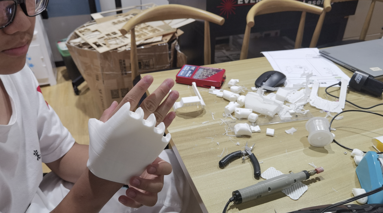 3)第二代原型制作,利用开源3D模型制作手掌机械结构。手指无法正常伸缩,需要进一步调整机械结构。