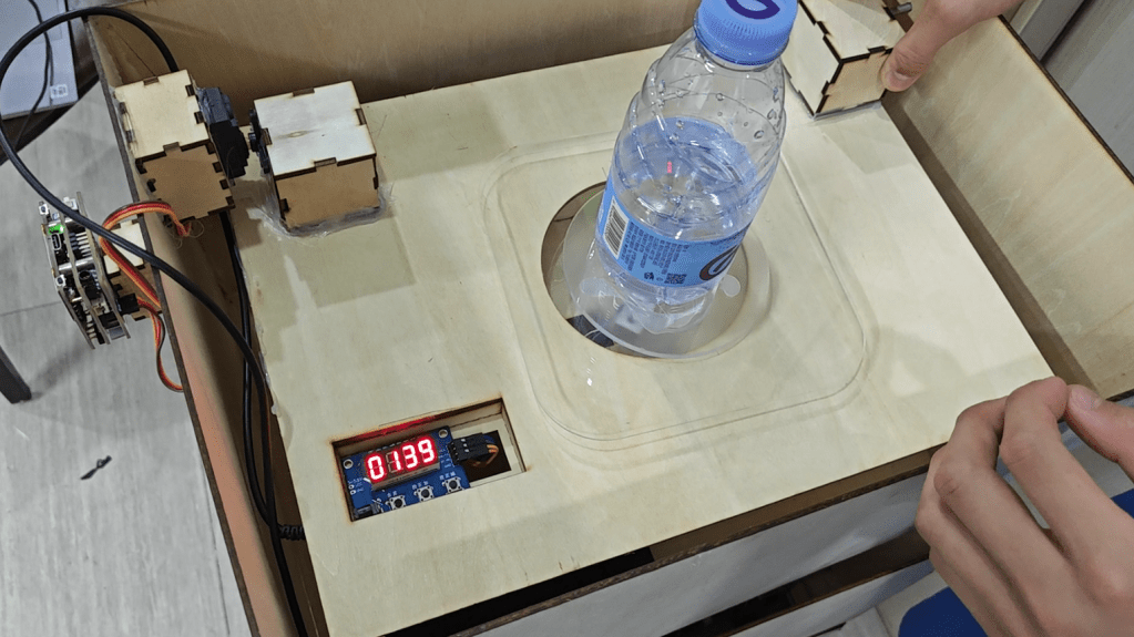 1.首先,先把塑料瓶放在里面。这个机器会帮助你自动测量物体的体重。测完多重之后门就会打开。