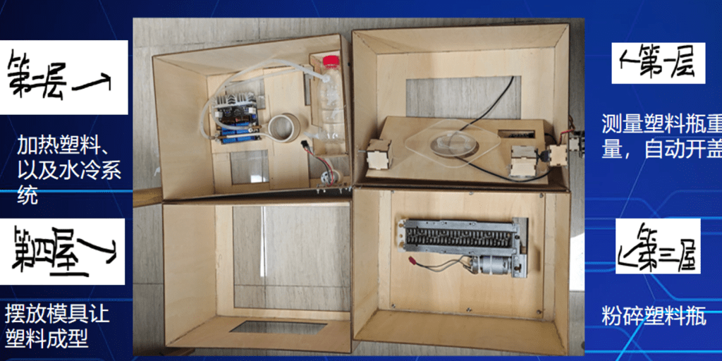 本作品可以放在社区回收塑料粉碎塑料,并通过加热之后,使用模具将其变成好玩的玩具,挂饰,有用的生活用品等,让回收塑料变得更加有趣。并反馈给学生或者是需要的社区人群。
