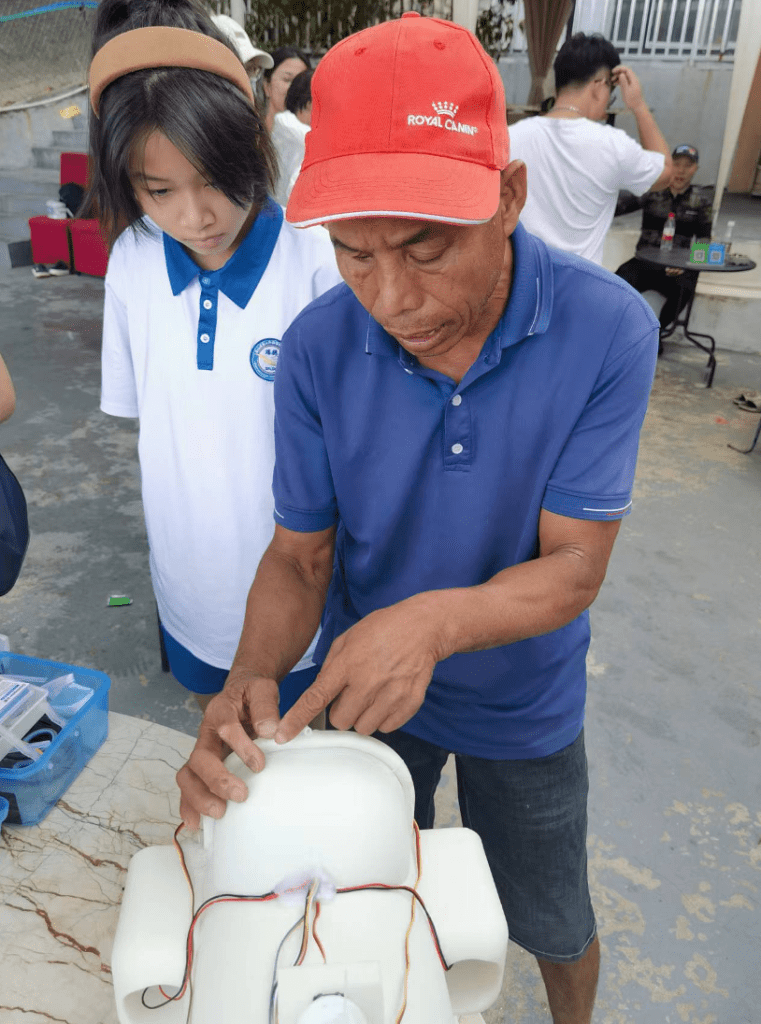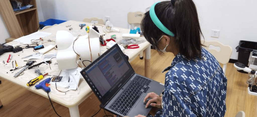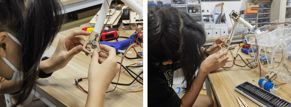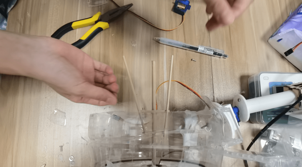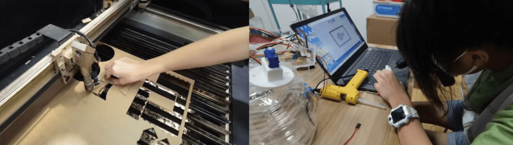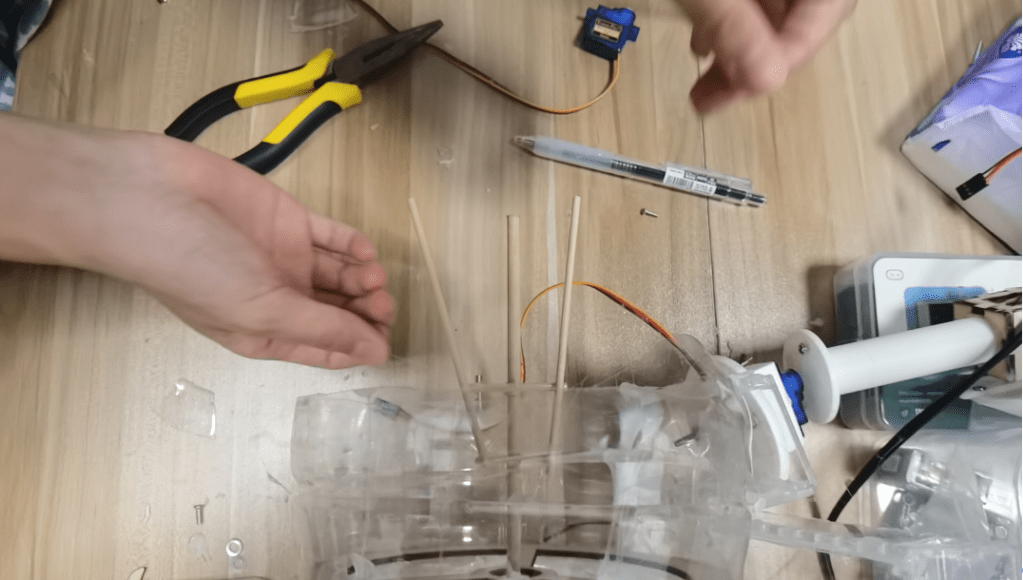 4.完成机械臂的制作之后,选择矿泉水空桶制作机器人外观作为样品,切割安装零件