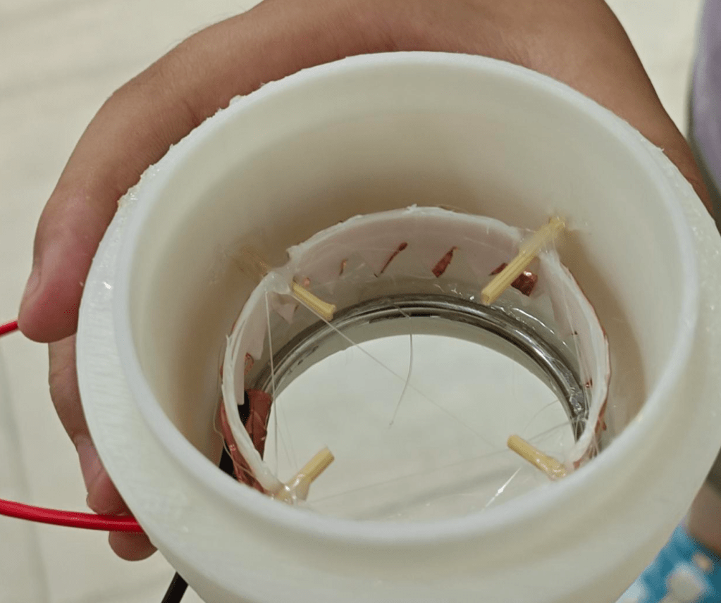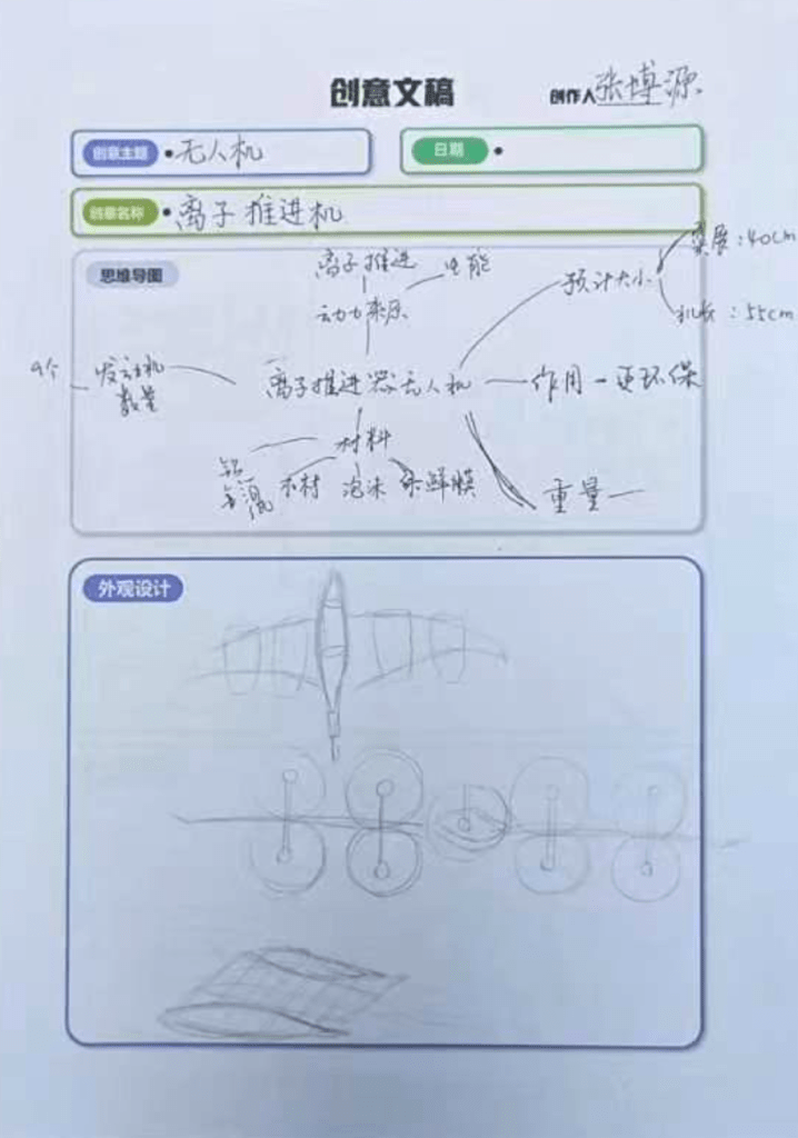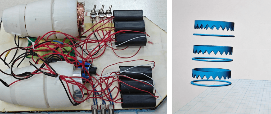 两个发动机均由 3D 打印机制作,发动机有 3 段(可拆分),叠加推力, 更高效地运用空间。发动机每段正极是环形锯齿状金属物,负极为圆形 铁环,向发动机输入电流的是 20 千伏的高压发生器,高压发生器的输 入电流为 7.4 伏电压。