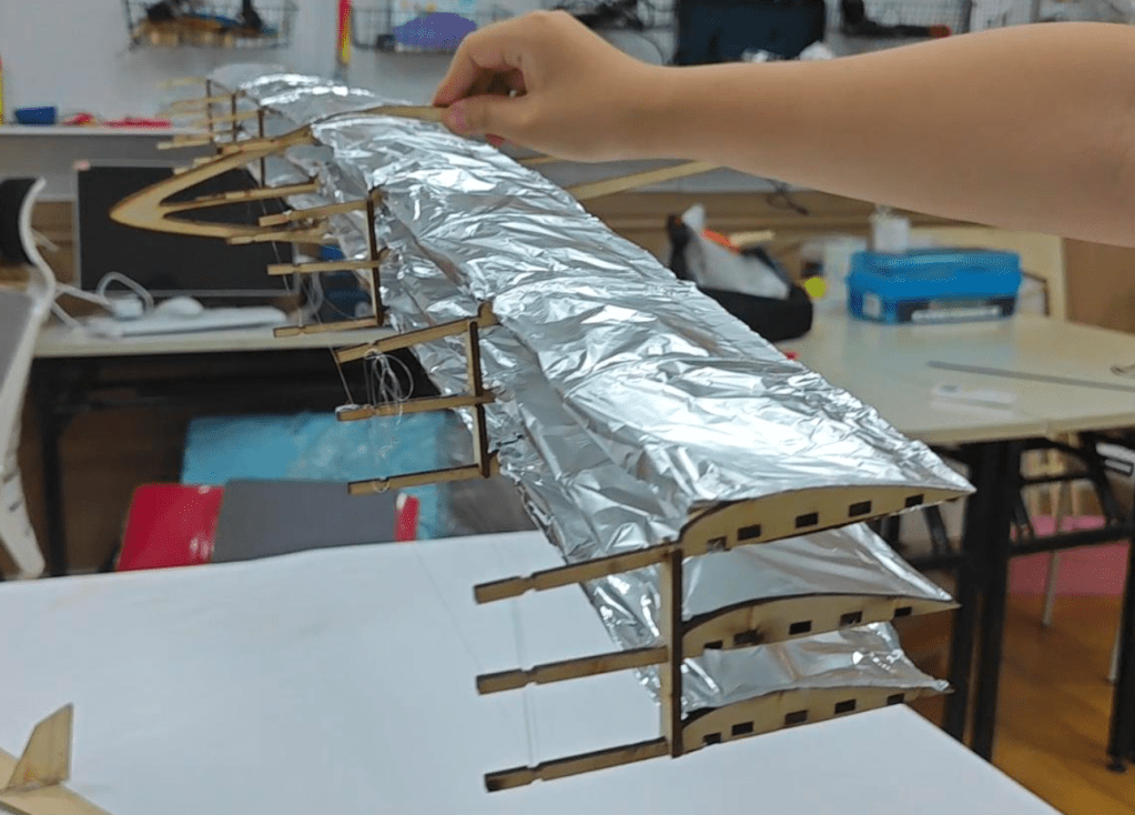 右:固定翼机身, 铝箔纸和铜丝 配合