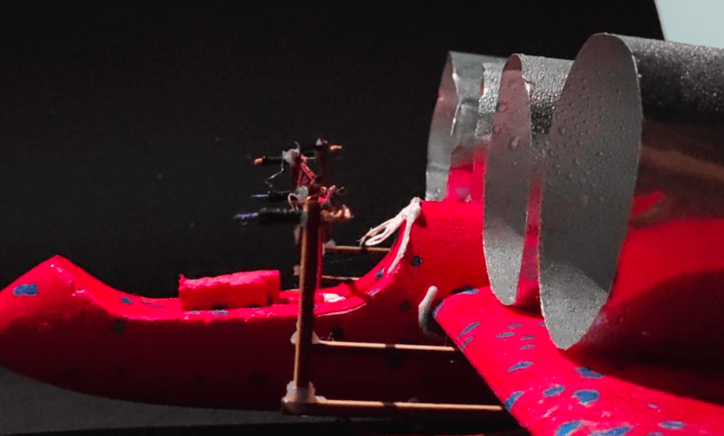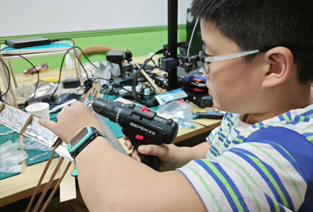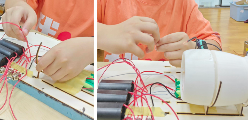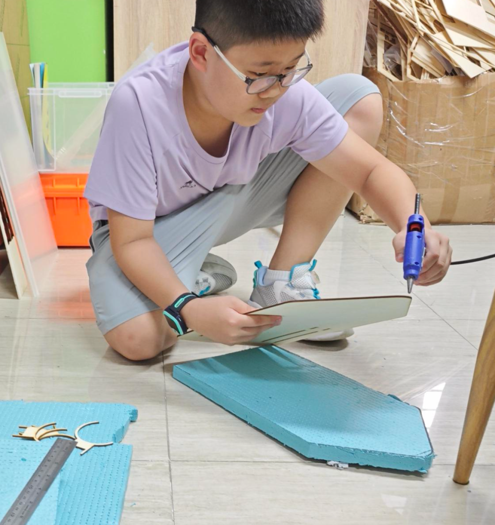 等离子推进船是一个由离子推进器作为动力来源的作品,船体上有 两个离子推进器,六个高压发生器,六个开关与十二个 3.7v 电压的电 池。船体下是模型专用泡沫,以形成浮力。制作过程:先用激光切割机 切除船的轮廓,再用高约 4cm 的模型泡沫用热熔胶粘贴于木板下。