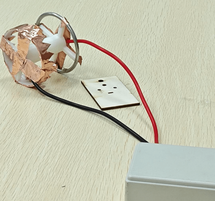 1.制作圆柱形离子推进器,为保证气流能够通过,设计为中空圆柱体,用激光切割机切出框架,再用铝箔纸将其覆盖,接通高压发生器的负极, 并将正极固定在木板上,木板有精确刻度,可上下移动,更换不同发动 机的型号与正负极间距(实验如图所示)。