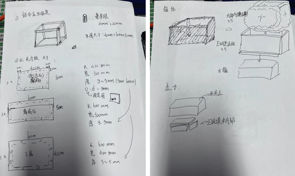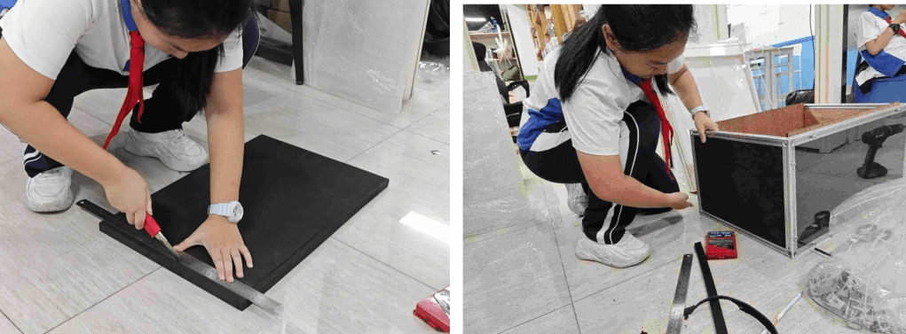 8.裁剪Eva棉板,安装进铝合金外框,5面都装好后,再将亚克力板安装在铝合金外框上(亚克力制作的盖子内也需要填充Eva绵板)