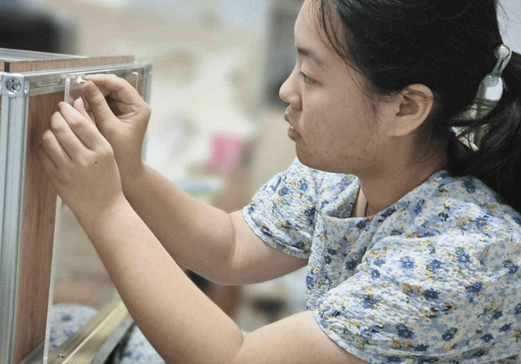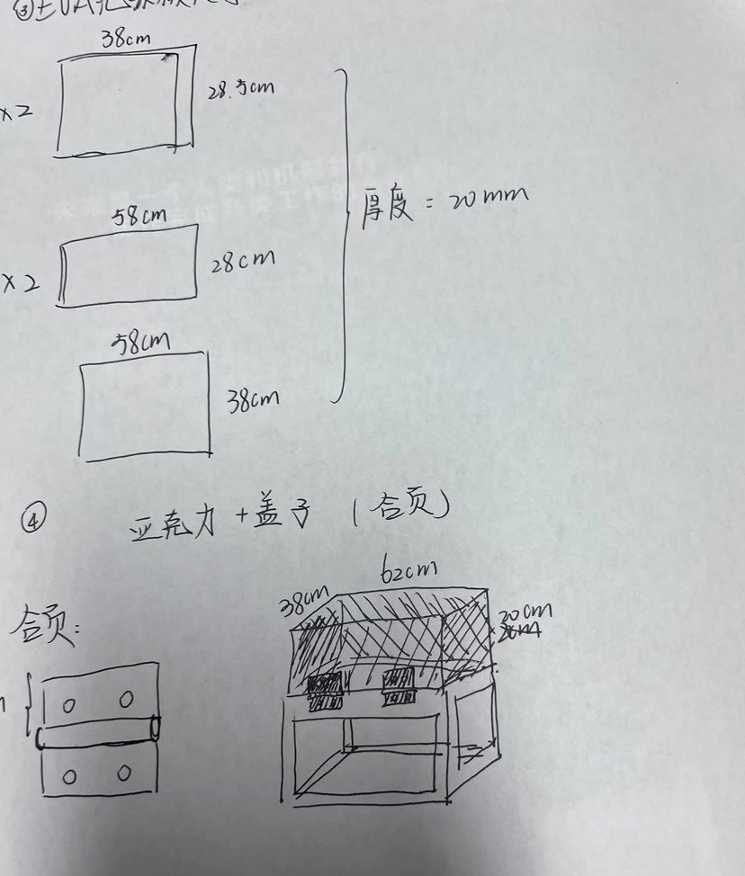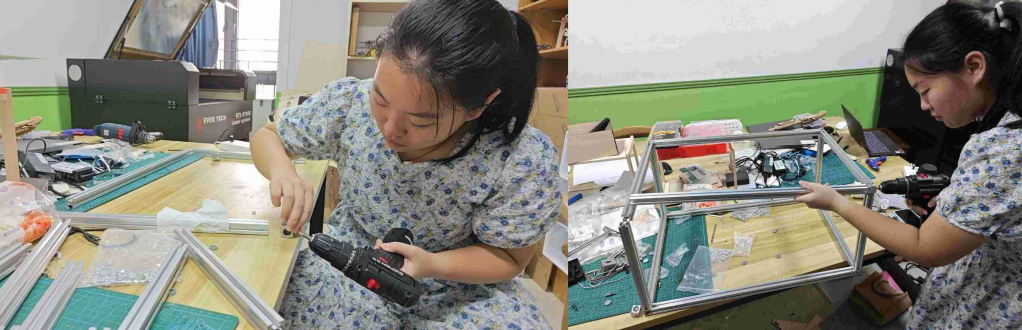5.组装铝合金外框架,用螺丝和螺母固定;组装木箱体,用热熔胶固定