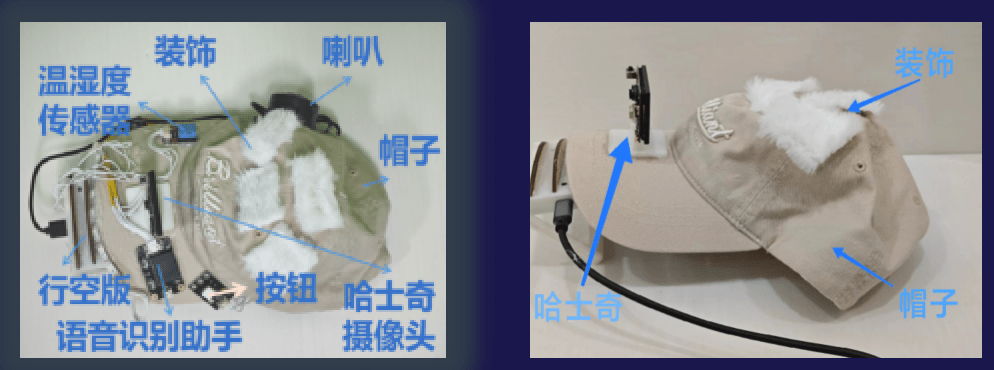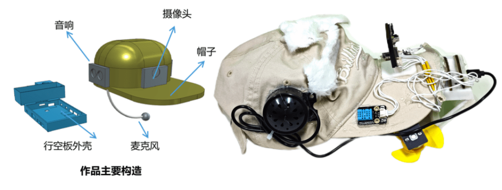 人工智能安全导航健忘提醒帽:项目搭载 AI 摄像头,可识别电梯、红绿灯等场景,通过前置彩屏实时提醒,助力老年人及痴呆患者规避风险、提升生活质量。
